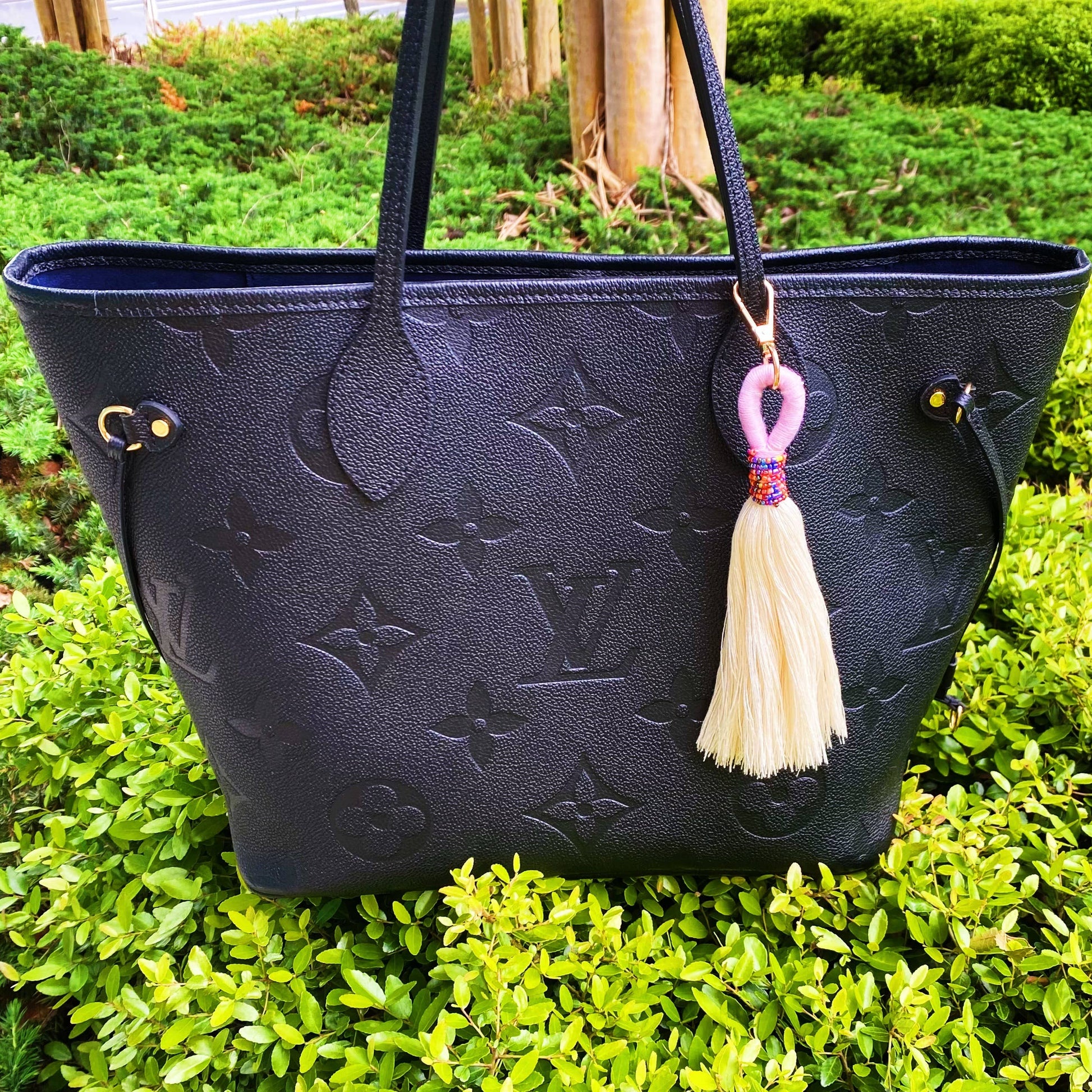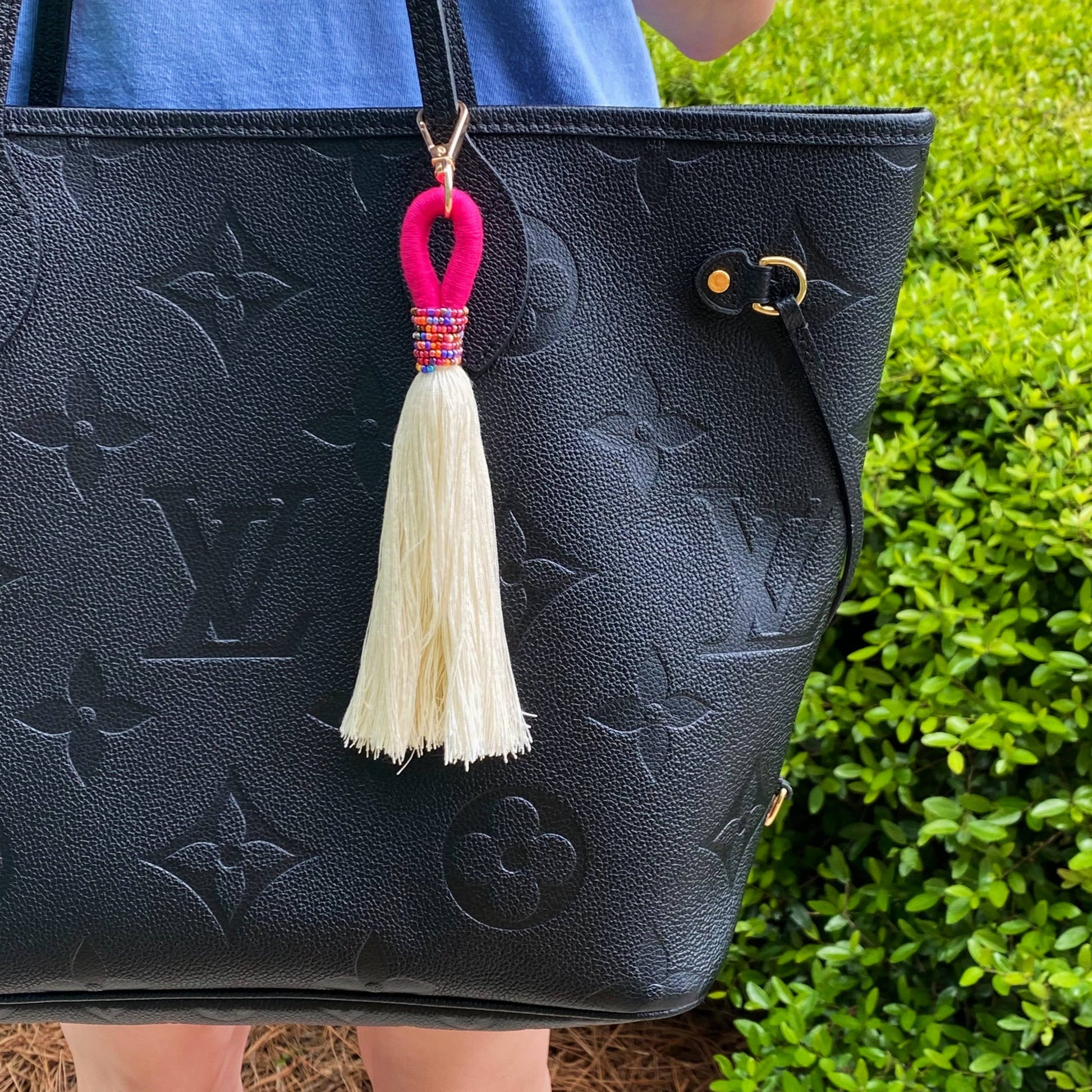 Absolutely beautiful tassel key chain in jewel beaded details and colorful threaded accent! Extended length and fuller tassel to make this key chain a perfect trendy statement piece
